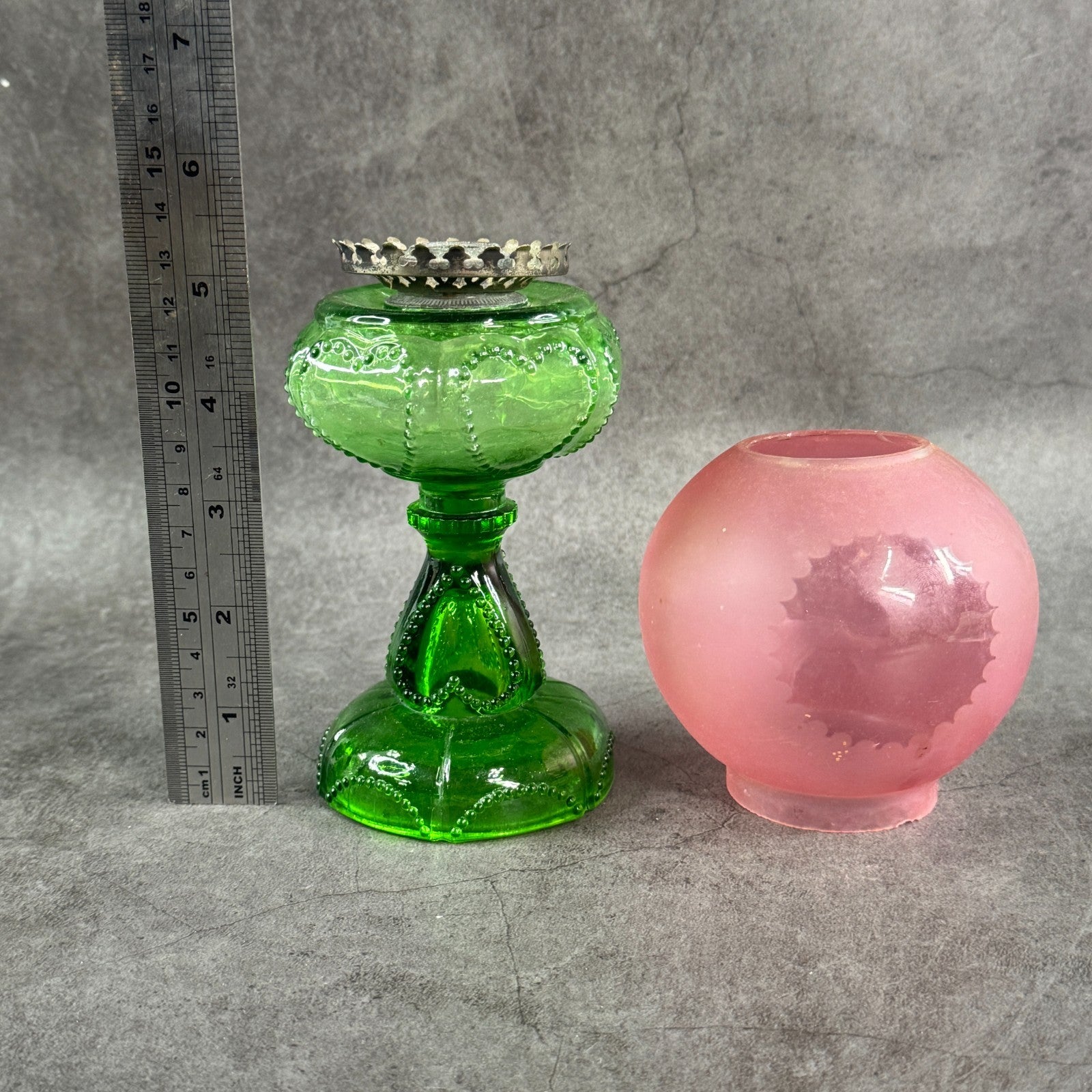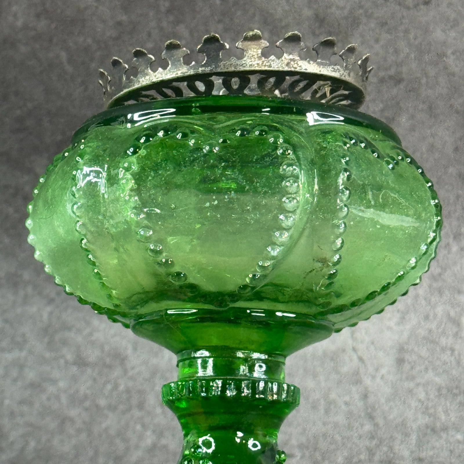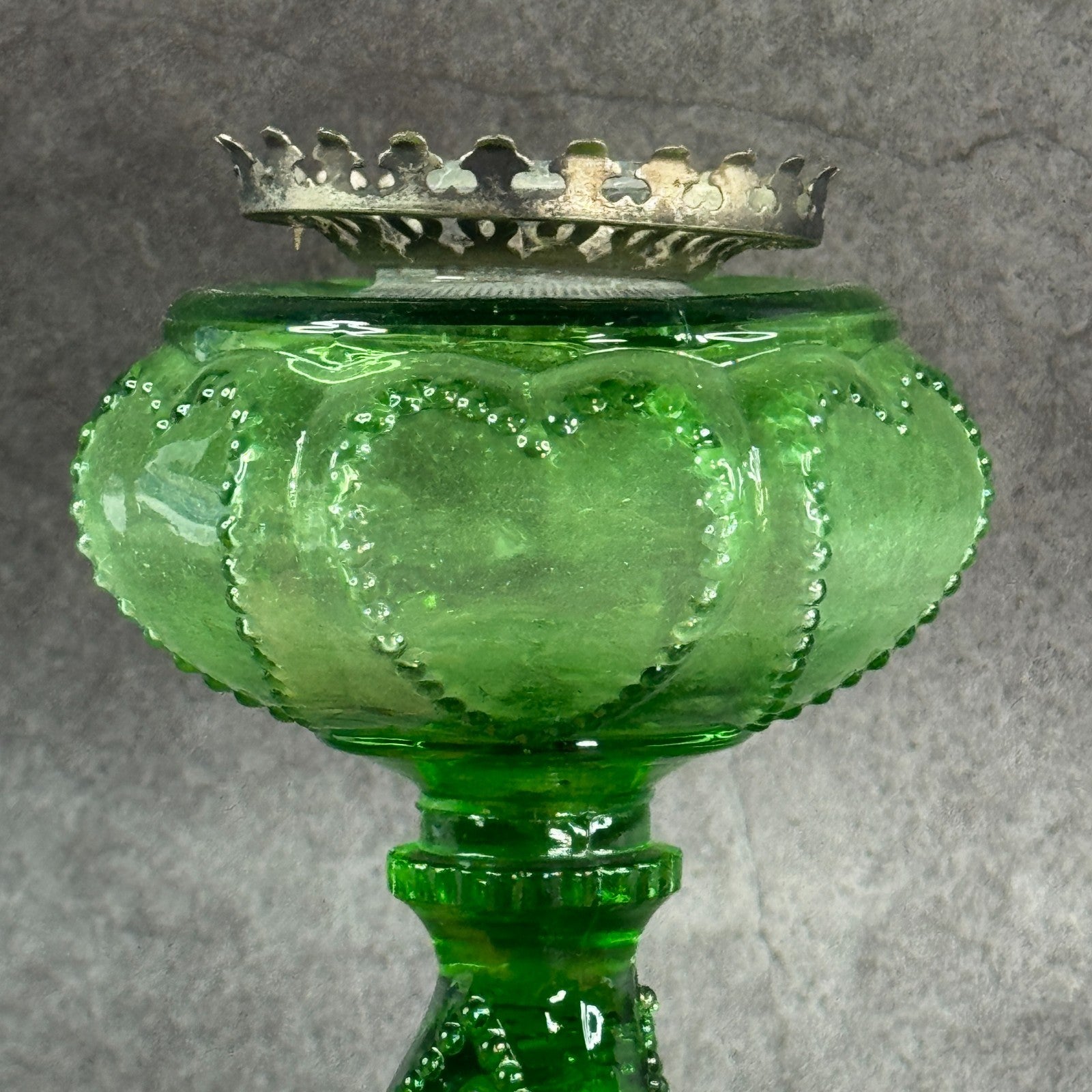 1930s Depression Glass Green Mini Oil Kerosene Lamp, EAPG, beaded Heart panels